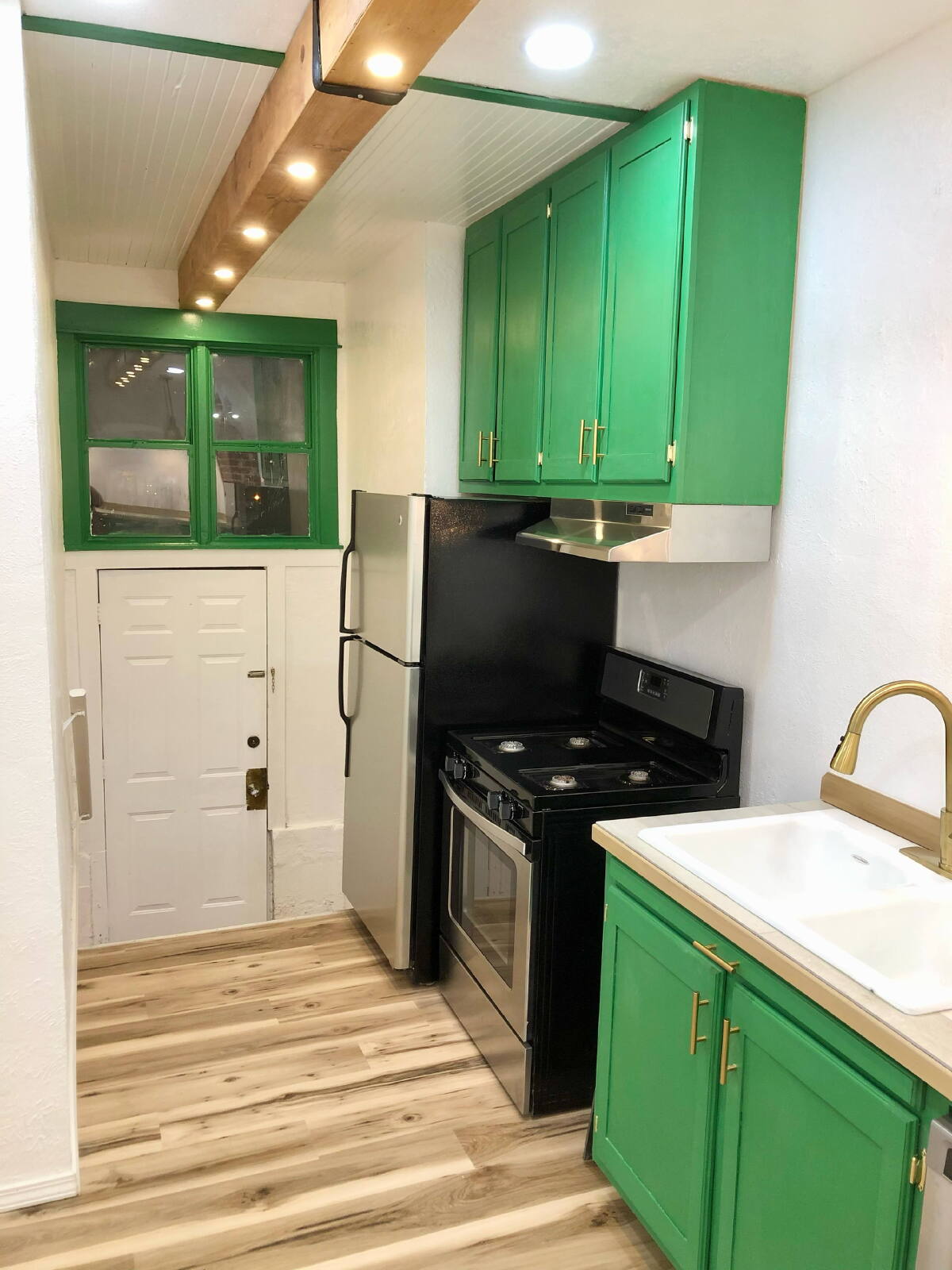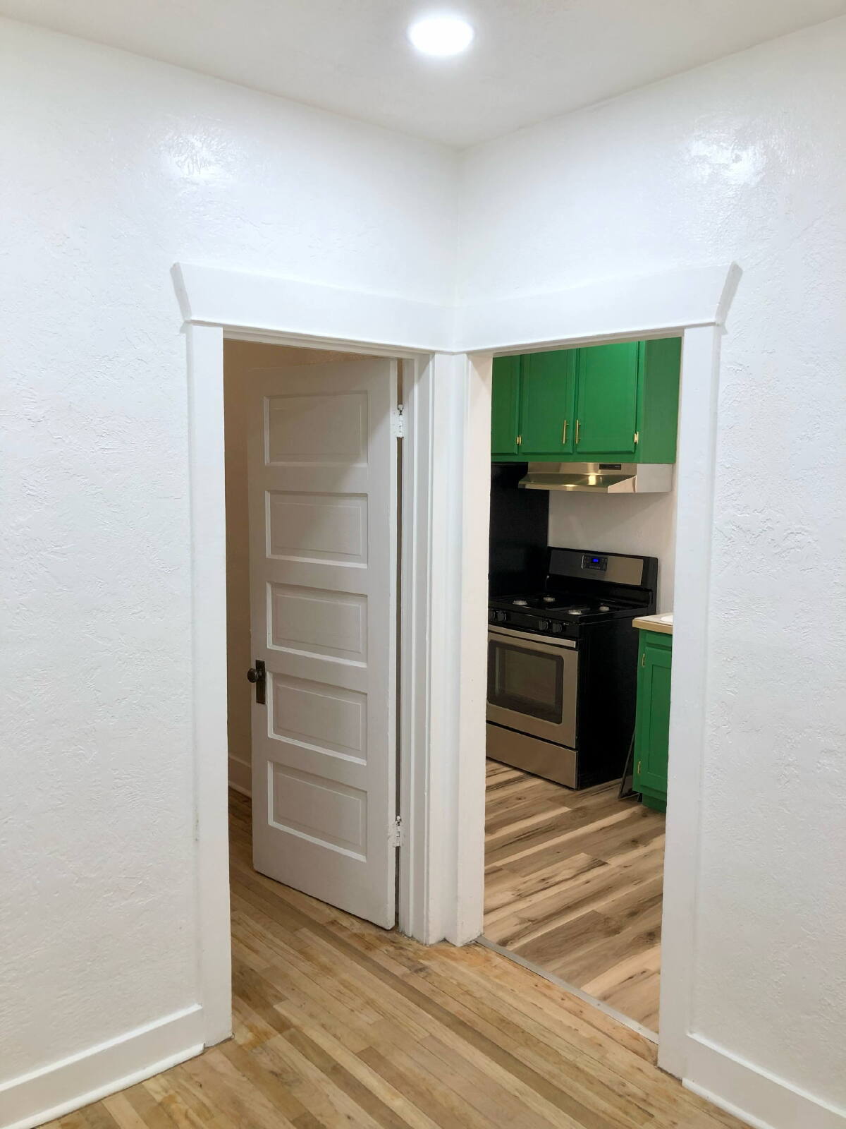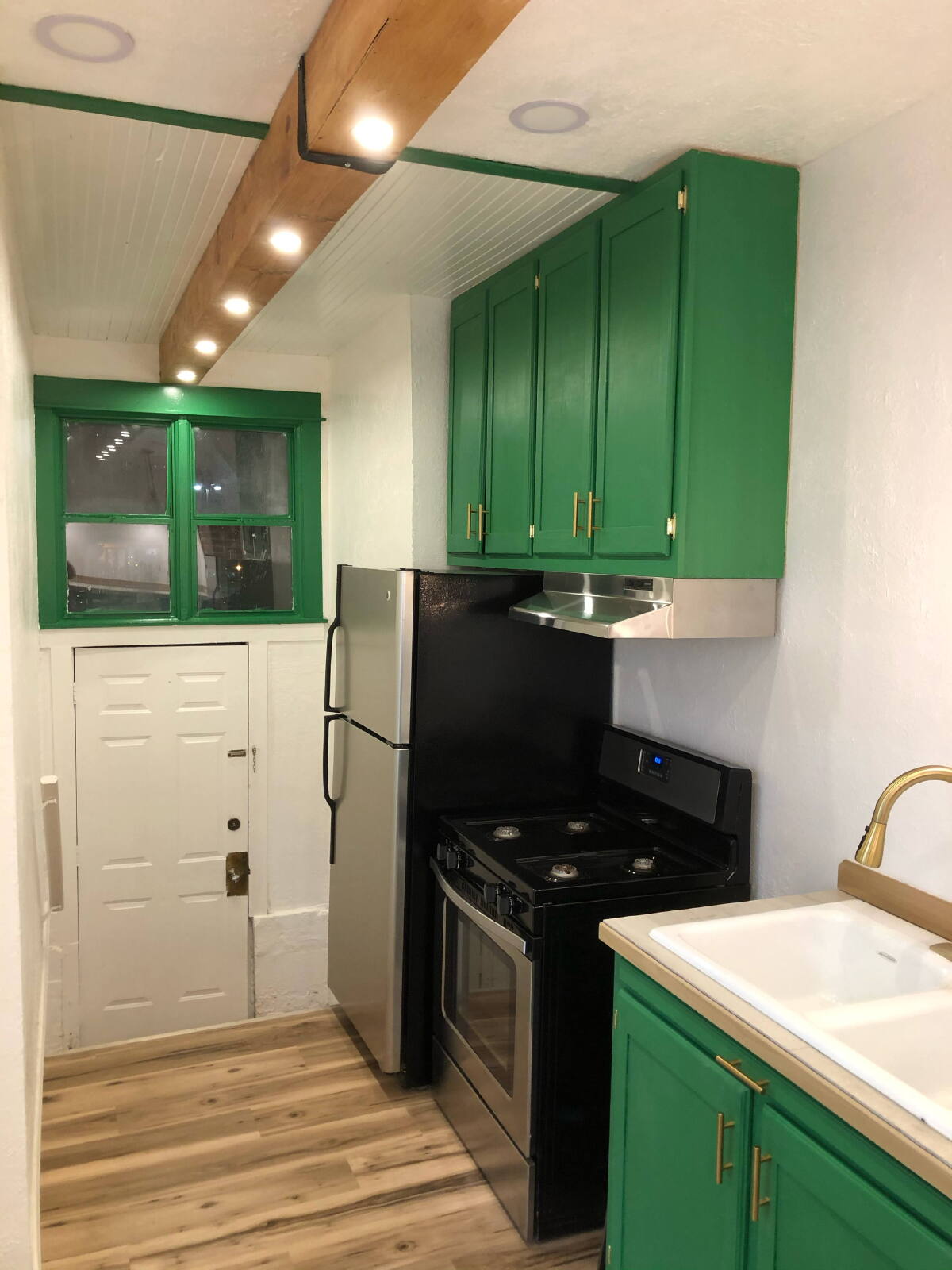 This 1 bedroom 1 bathroom apartment is newly remodeled. It has unique details such as a barn door, custom kitchen cabinets, and a decorative beam along with a custom-built vanity in the bathroom. The original oak floors and the extra tall ceiling give the apartment a spacious feel, as does the abundant natural light from the windows!